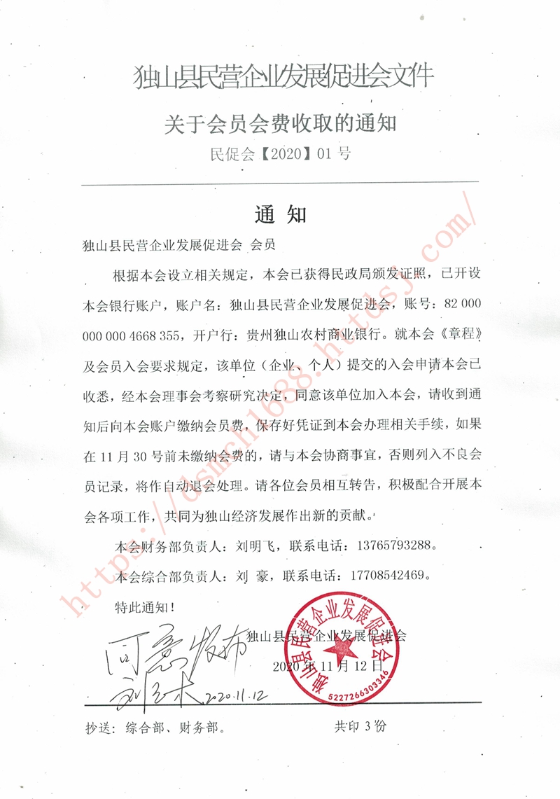根据本会设立相关规定,本会已获得民政局颁发证照,已开设本会银行账户,账户名:独山县民营企业发展促进会,账号:82 000 000 000 4668 355,开户行:贵州独山农村商业银行。就本会《章程》及会员入会要求规定,该单位(企业、个人)提交的入会申请本会已收悉,经本会理事会考察研究决定,同意该单位加入本会,请收到通知后向本会账户缴纳会员费,保存好凭证到本会办理相关手续,如果在11月30号前未缴纳会费的,请与本会协商事宜,否则列入不良会员记录,将作自动退会处理。请各位会员相互转告,积极配合开展本会各项工作,共同为独山经济发展作出新的贡献。