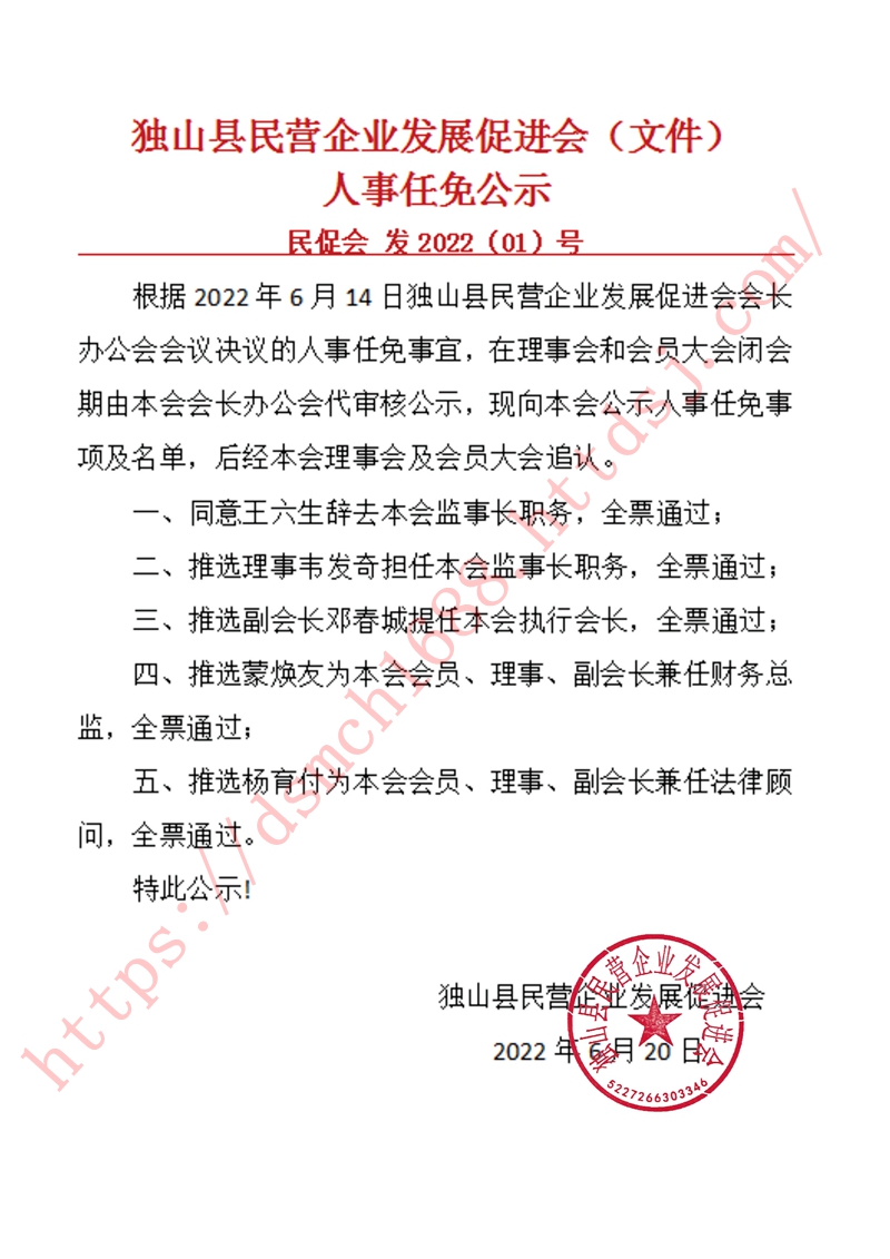 根据2022年6月14日独山县民营企业发展促进会会长办公会会议决议的人事任免事宜,在理事会和会员大会闭会期由本会会长办公会代审核公示,现向本会公示人事任免事项及名单,后经本会理事会及会员大会追认。