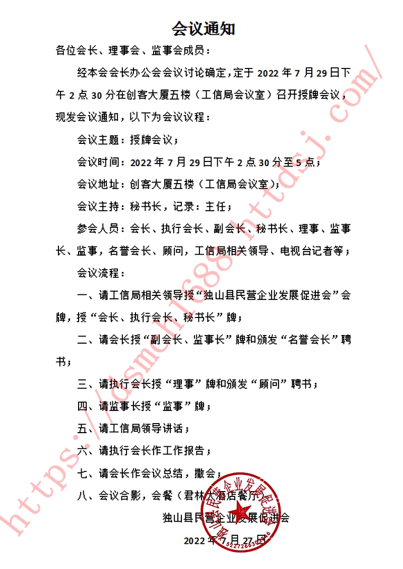 经本会会长办公会会议讨论确定,定于2022年7月29日下午2点30分在创客大厦五楼(工信局会议室)召开授牌会议,现发会议通知,以下为会议议程: